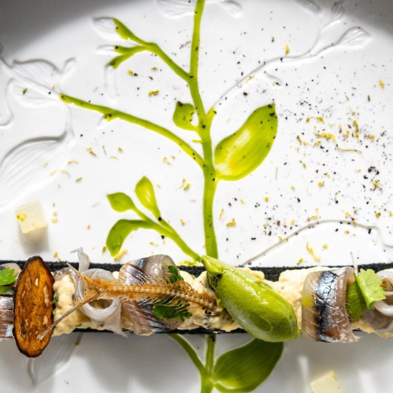 Anchois de pays fumé, seiche, caviar d’aubergine grillée et coriandre transie
