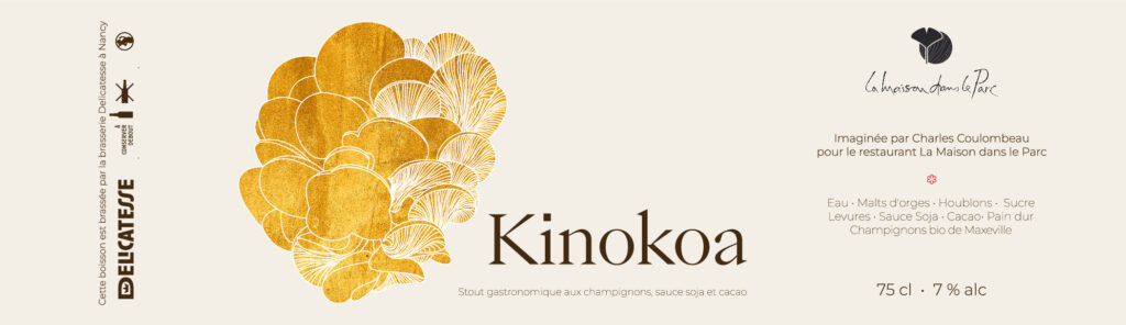 La bière au champignon est une bière artisanale gastronomique unique. Fortement inscrite dans son époque et son terroir, cette bière permet de mettre en avant les superbes pleurotes bio de Maxéville et valorise également les excédents de pain du restaurant qui sont torréfiés puis brassés tel une céréale. Cette stout aux saveurs uniques de champignon, de sauce soja et de cacao doit son nom à la contraction du terme japonais kinoko et de l’anglicisme cocoa. A déguster en accord d’un filet de bœuf, d’un fromage, d’un dessert aux noix, les possibilités sont infinies.