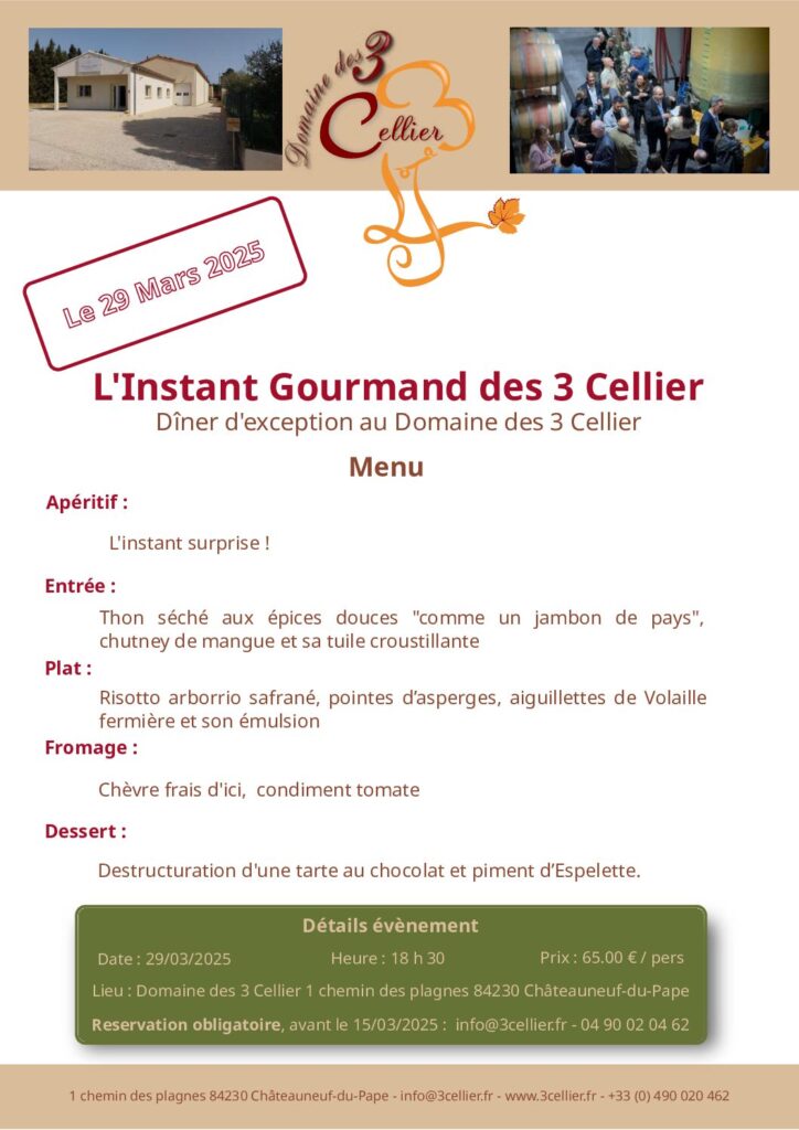 Le Domaine des 3 Cellier vous propose « L’Instant Gourmand », une expérience culinaire inédite qui célèbre l’alliance parfaite entre la gastronomie et l’œnologie. Cet événement met en avant le savoir-faire culinaire du Chef Matthieu Malvoisin, réputé pour son style culinaire et sa capacité à allier tradition et innovation, qui propose un menu dégustation. Au programme de […]