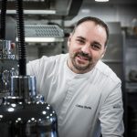 Détailler des gambas fumées en lamelles de carpaccio. Laquer au jus d’orange et huile d’olive. Préparer une purée de carottes infusée de gingembre et citronnelle, la zester aux zestes d’oranges, ajouter la coriandre ciselée. La monter au siphon pour une texture mousse. Agrémenter de coriandre et de pignons de pin frais, pas toastées.
