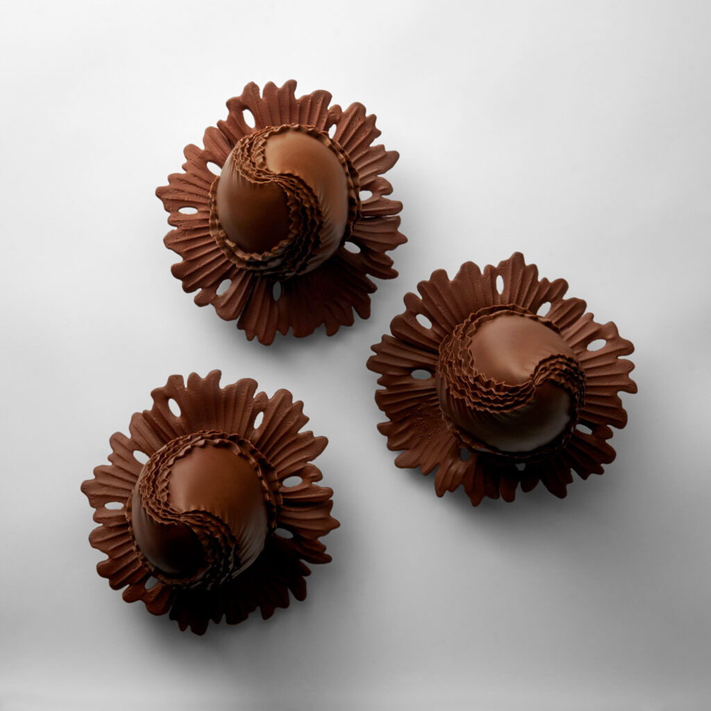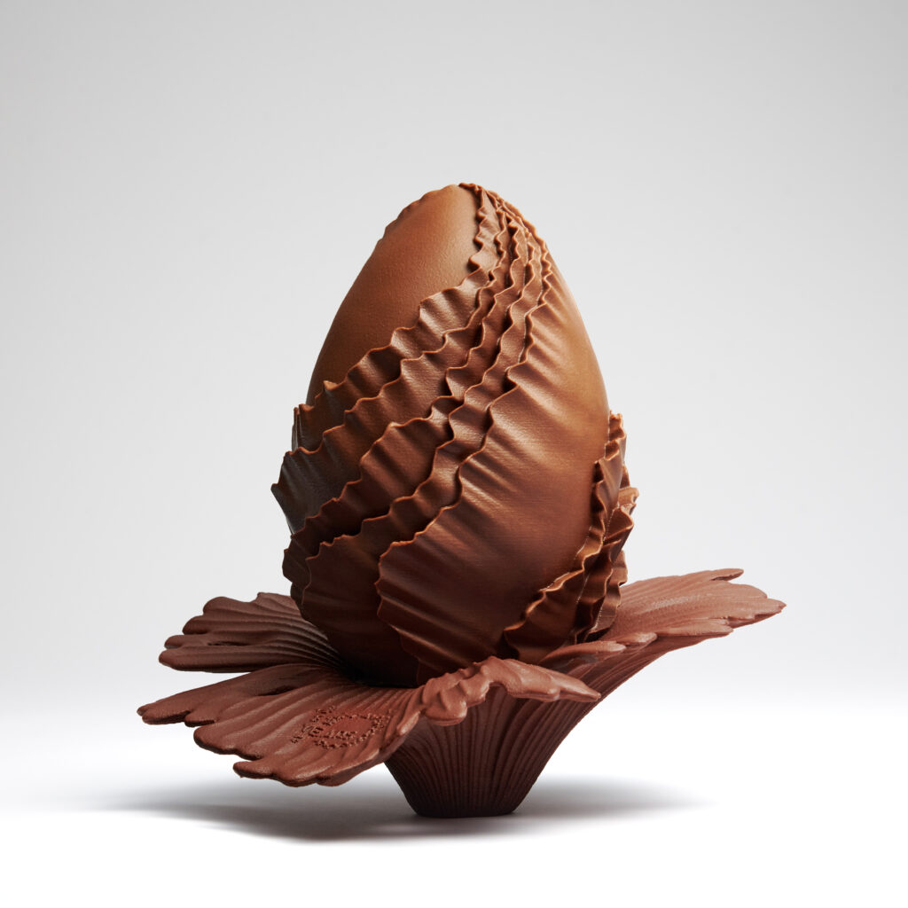 Un bourgeon floral repose sur un feuillage aux reflets cacaotés, s’inspirant subtilement de «Dancing Leave », la majestueuse structure en Cristal de Bohème soufflé installée dans le hall d’entrée du palace. Élégant témoignage des 10 ans de l’hôtel, l’œuf déploie délicatement ses 10 pétales afin de laisser apparaître gracieusement son cœur. Sur une base de chocolat noir garni d’une ganache au chocolat au lait, à la vanille verte et à la vanille bleue, l’œuf invite à découvrir cet ingrédient dans toute sa finesse.